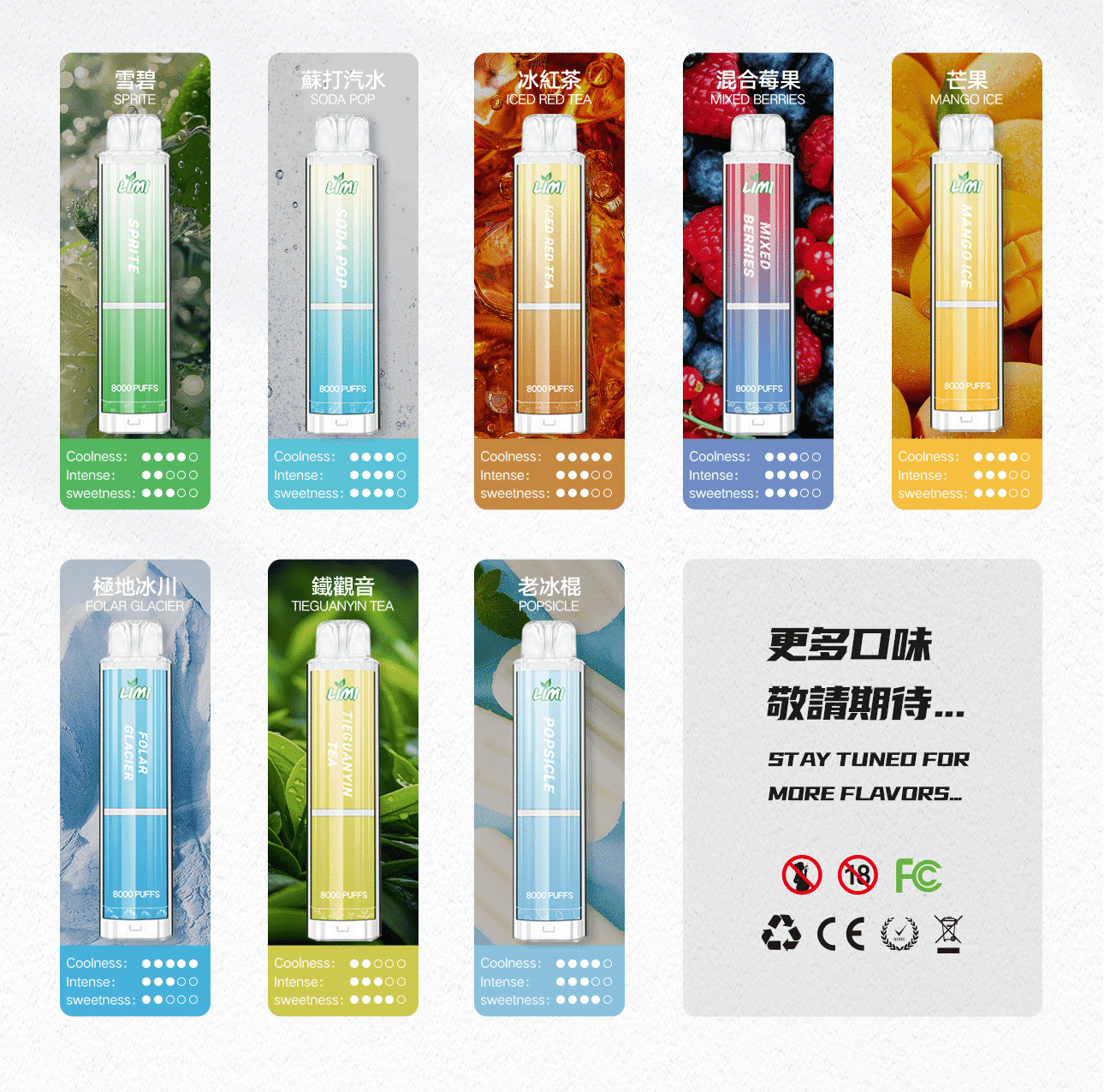 LIMI 8000口一次性電子煙提供超大容量,適合重度使用者。內置 550mAh 電池與 15ML 煙油,提供長達 8000口 的使用體驗。可充電,使用完畢即可拋棄。